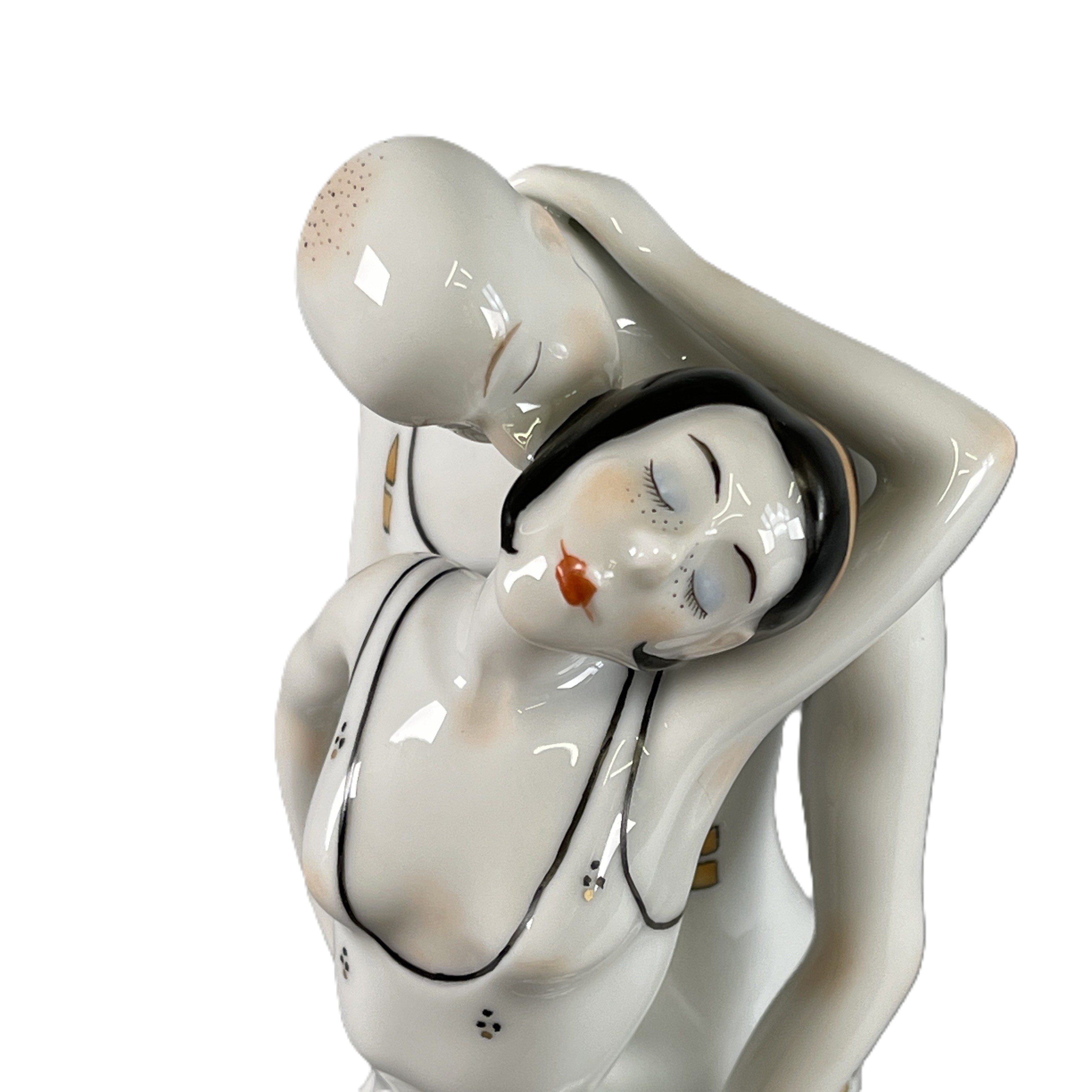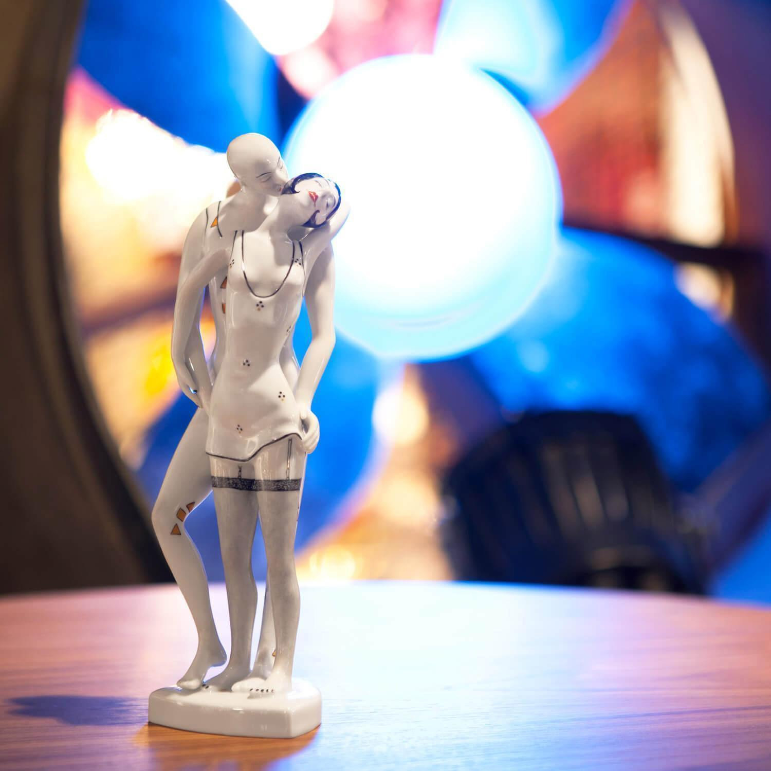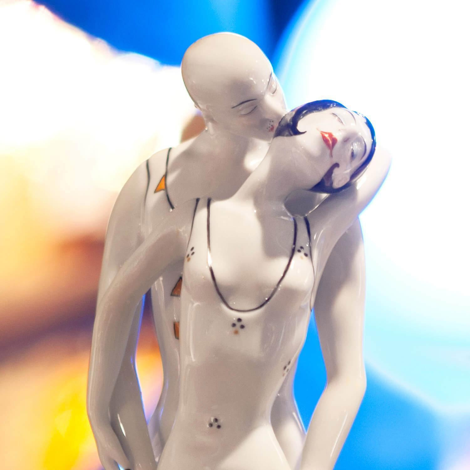 Das Thema dieser Porzellanserie von Kati Zorn ist der beschwerliche Weg der Geschlechter zueinander. Die Darsteller der Geschichte sind Frau und Mann und der geflügelte Eros. Die Plastik aus glasiertem Porzellan zeigt Mann und Frau, die sich endlich gefunden haben. Er steht hinter ihr, umfasst sie liebevoll an den Hüften und küsst ihren Nacken. Mit dem Rücken an ihn geschmiegt, umarmt sie zärtliche seinen Hals und streichelt mit ihrer rechten Hand sanft über den Arm, mit dem er Sie berührt. Das Paar strahlt sinnliche Liebe und Erotik aus und spielt leicht bekleidet mit der Phantasie des Betrachters. Das knappe Kleidchen mit seinem tiefen Dekolleté betont ihre Weiblichkeit. Lasziv hochgerutscht lässt es den Blick auf ihre Beine in dunklen Dessous aus Strapsen und Nylons frei. Eine Glatze, breite Schultern und deutlich modellierte Muskeln symbolisieren seine Männlichkeit. Mit »Happy End« schafft Kati Zorn es, den emotionalen Höhepunkt aus zärtlicher Liebe und prickelnder Erotik in Porzellan zu bannen.Alle unsere Artikel aus feinstem Porzellan werden in unseren eigenen Betrieben in Deutschland hergestellt.