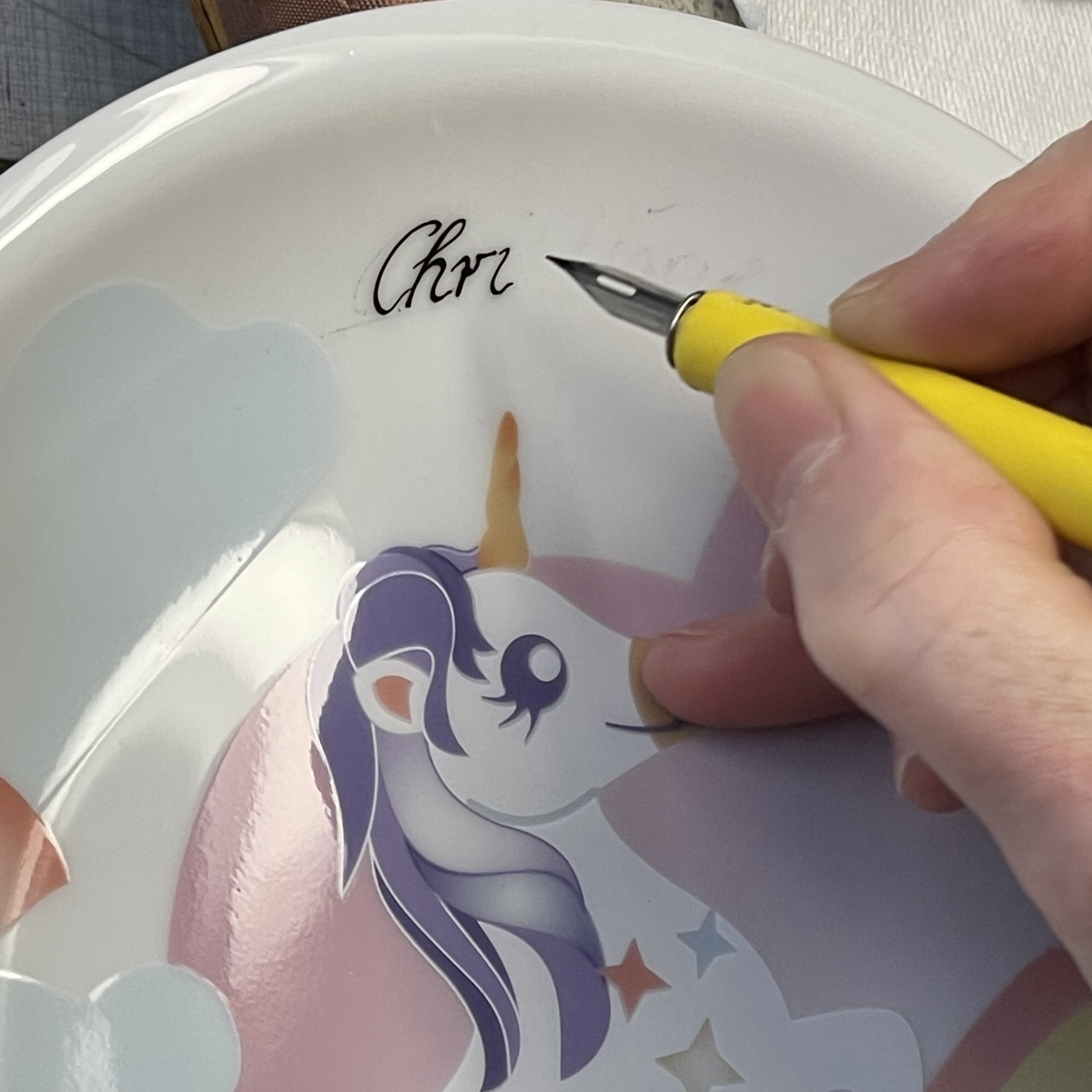 Der Frühstücksteller wird per Hand, ganz individuell mit dem Namen beschriftet oder mit Monogrammen, Spitznamen, u. ä. verzieren. Sie gestalten so ein eigens auf das Kind bezogenes, persönliches Präsent.
