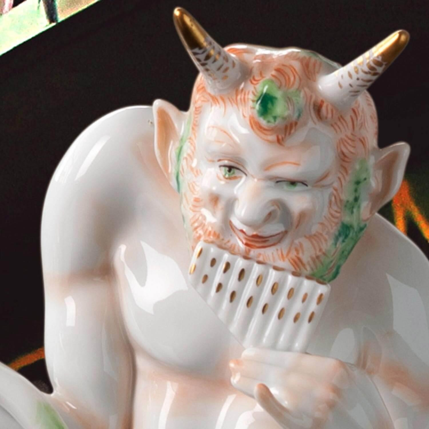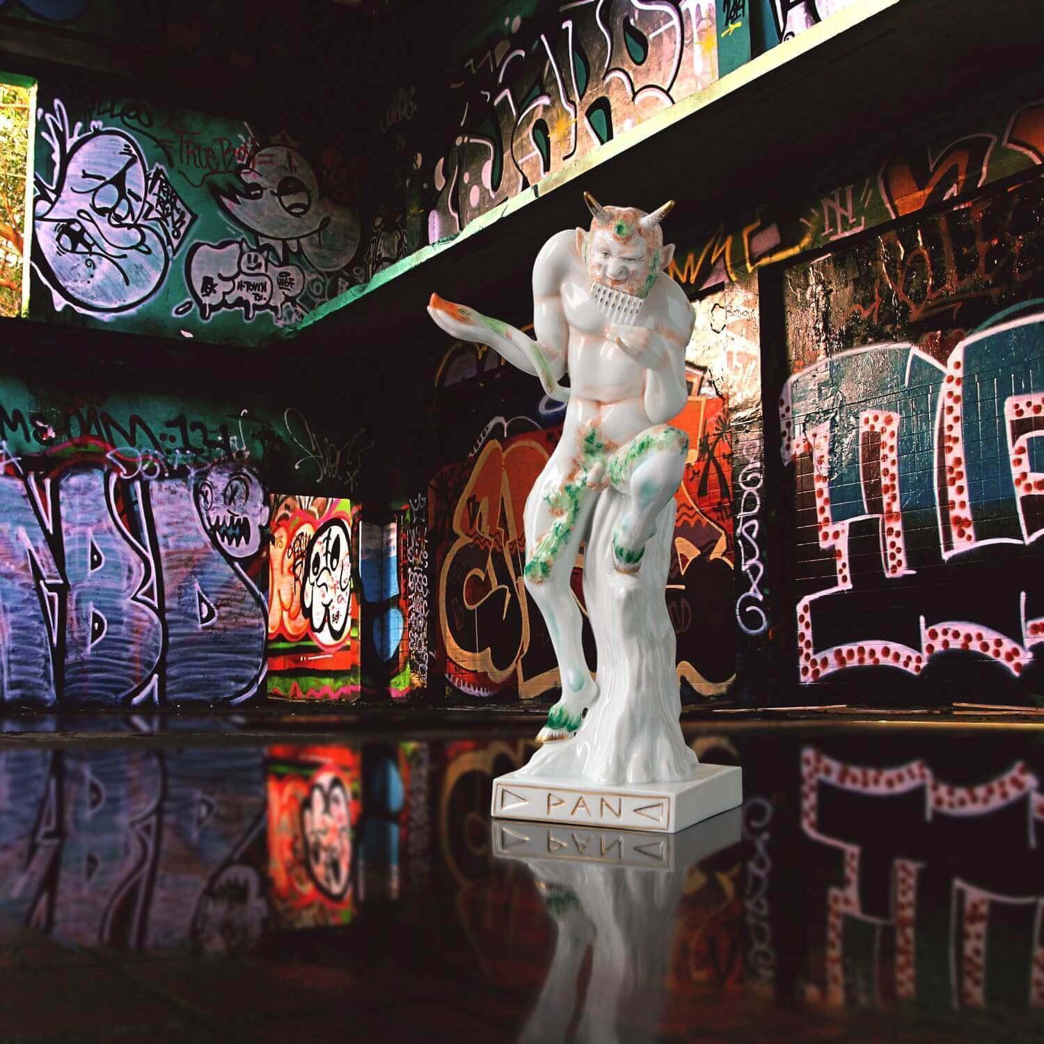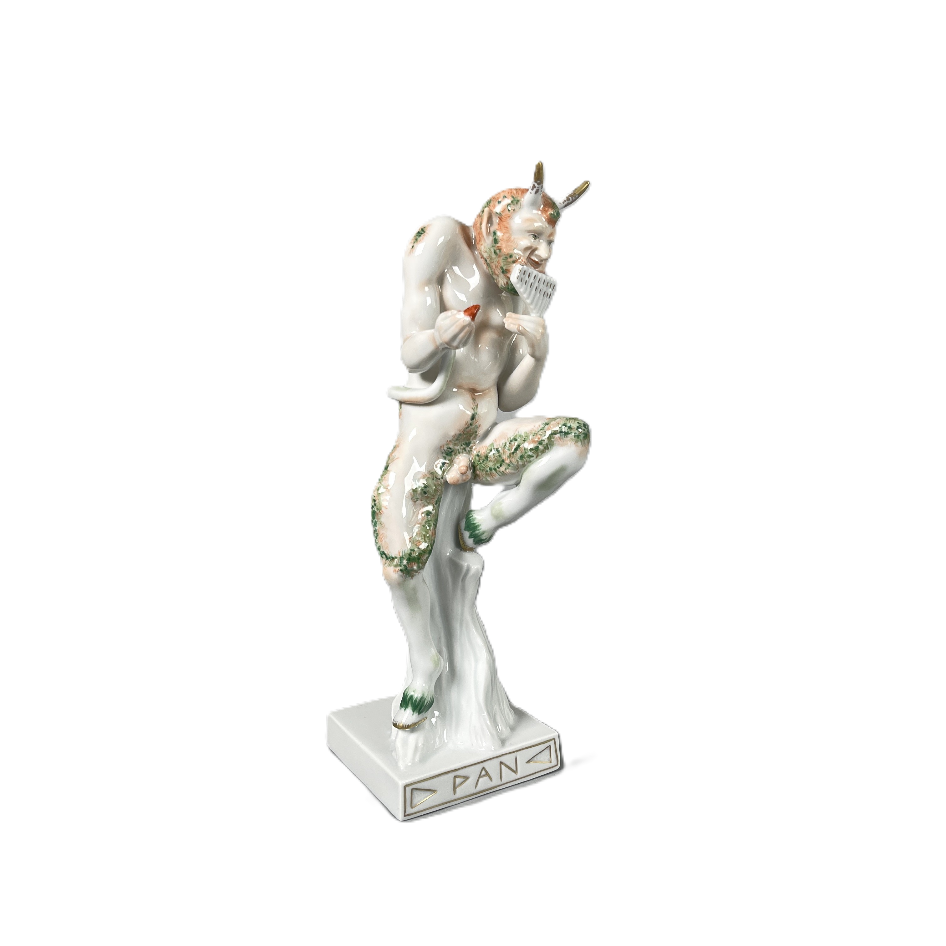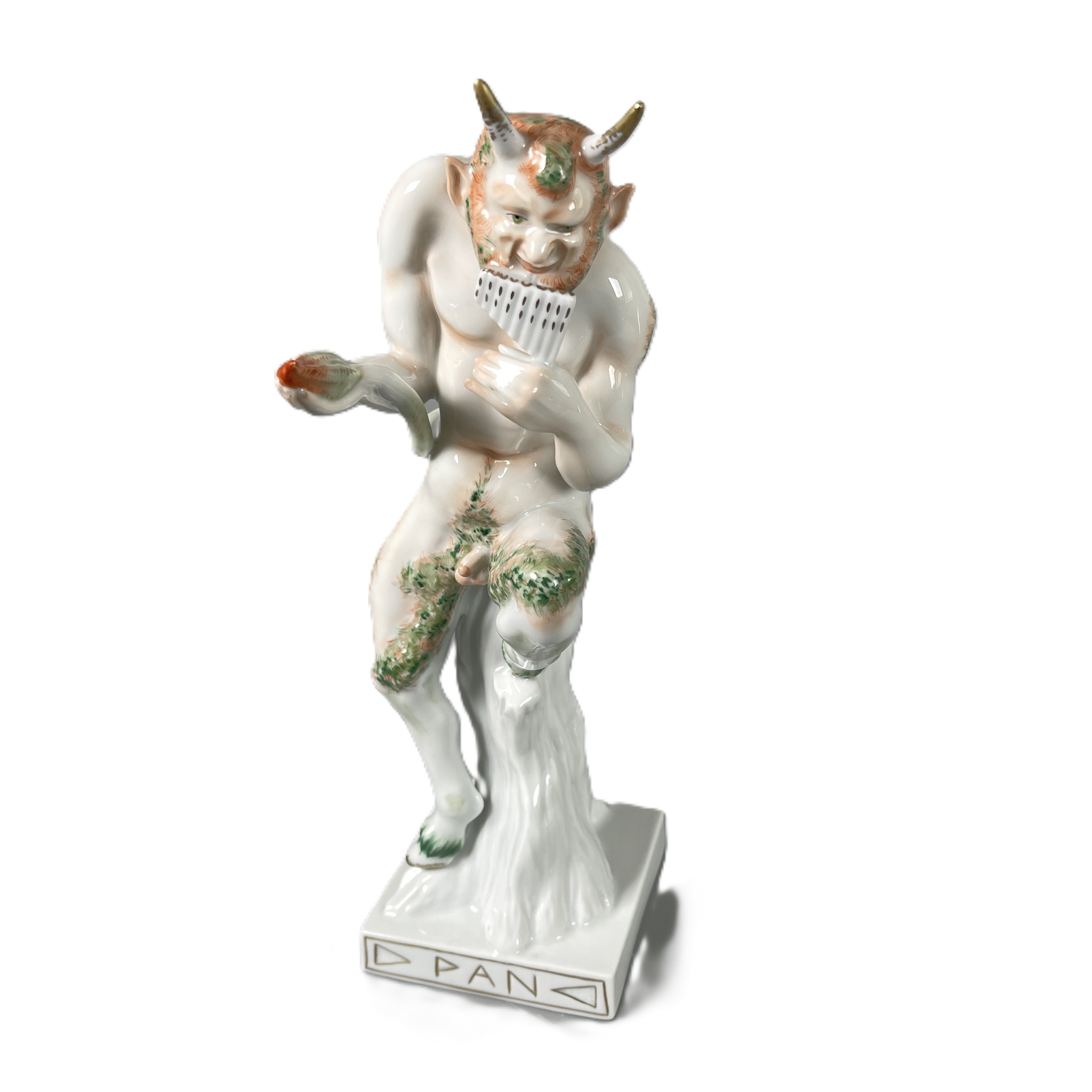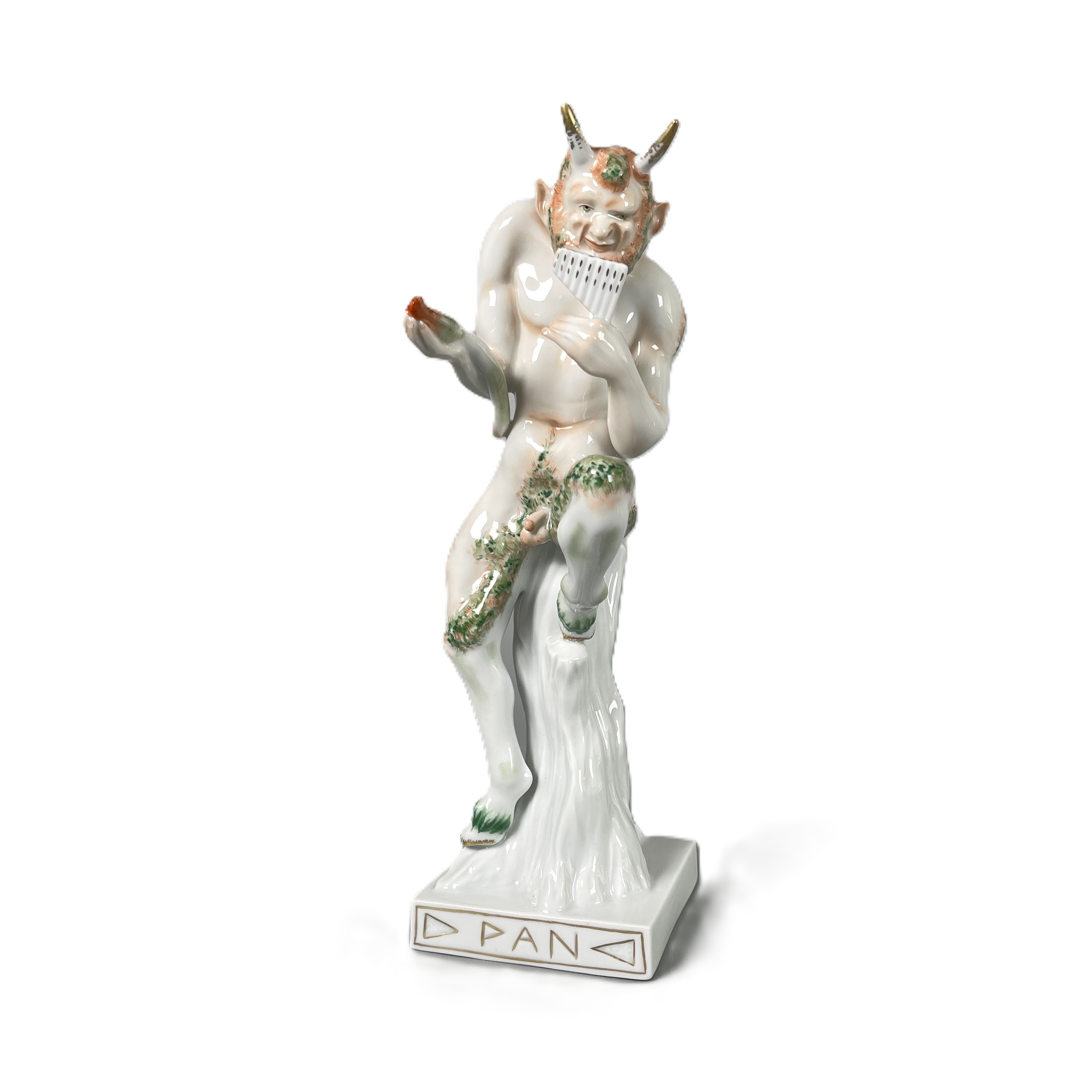 Diese Figur aus Porzellan zählt zu einer Reihe von Plastiken zu Themen aus der griechischen Mythologie. Kati Zorn modelliert mit viel Liebe zum Detail und interpretiert die Geschichte Pans auf die für sie unverkennbaren Art und Weise.In der griechischen Mythologie ist Pan der Gott der Hirten, der Wiesen und Wälder. Dargestellt als Mischwesen mit der Gestalt eines Menschen und dem Unterkörper eines Ziegenbocks, wird er meist als nicht besonders schön beschrieben. Die Hirten fürchteten sich sogar vor ihm und seinem gehörnten Anblick.So erging es auch der Nymphe Syrinx. Pan verliebte sich in sie, doch blieb diese Liebe unerwidert. Im Gegenteil: Syrinx ergriff die Flucht und wusste sich am Ende nicht anders zu helfen, als ihre Schutzgöttin darum zu bitten sie in ein Schilfrohr zu verwandeln, um Pan zu entgehen.Pan, eben noch die geliebte Nymphe vor Augen, hielt plötzlich nur noch ein Schilfrohr in den Händen. Um seine Liebe für immer bei sich zu haben, zerschnitt er das Schilfrohr in verschieden große Stücke, band diese zusammen und erfand so die Panflöte.Kati Zorn greift mit Ihrer Skulptur aus Porzellan diese Begebenheit auf. Der mit einem goldenen Schriftzug verzierte Sockel trägt einen Baumstumpf, auf dem es sich ein Flöte spielender Pan bequem gemacht hat. Pan stützt sich mit den gespreizten Beinen eines Ziegenbocks auf Boden und Baustamm, und präsentiert ungeniert seine Männlichkeit. Sein menschlicher Oberkörper ist in einer gedrungenen Haltung dargestellt und wirkt fast verwachsen. In der einen Hand hält Pan seinen Ziegenschwanz, mit der anderen hebt er die Flöte zum Spiel vor die Lippen.Das von Kati Zorn modellierte Haupt lässt einen das Unbehagen der Hirten und die Abneigung der Nymphe verstehen. Wilder Haar- und Bartwuchs umrahmen ein grobes Gesicht mit schiefen Augen, Hakennase und hervorstechenden Wangenknochen. Abgerundet wird das unvorteilhafte Erscheinungsbild durch spitze Ohren und Hörner. Pans Mangel an Schönheit unterstreicht die Künstlerin durch die zurückhaltende Bemalung der Porzellanfigur.Alle unsere Artikel aus feinstem Porzellan werden in unseren eigenen Betrieben in Deutschland hergestellt.