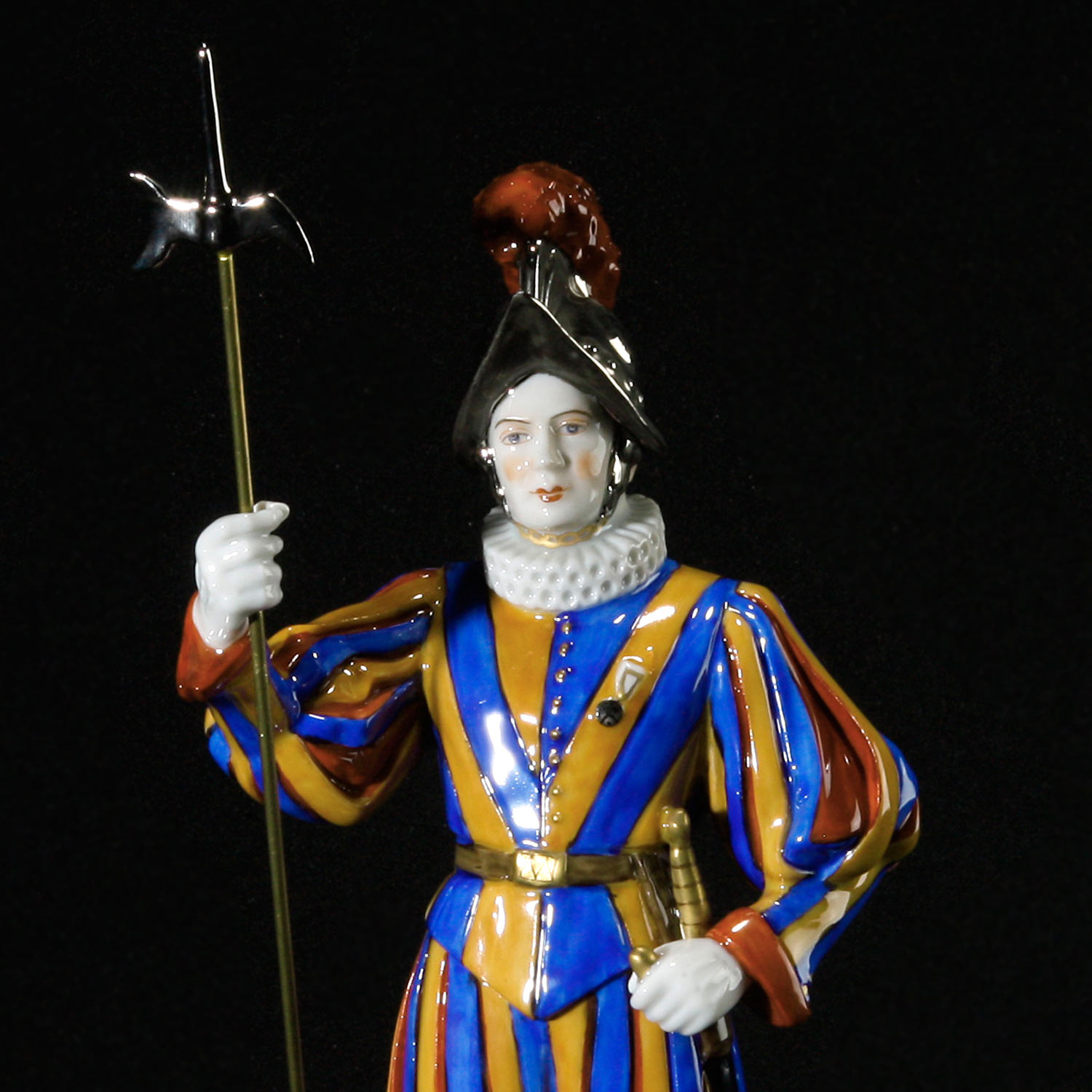 Glasiertes Porzellan. Farbige Malerei. Detailgetreue Darstellung eines Mitglieds der vatikanischen Schweizergarde.