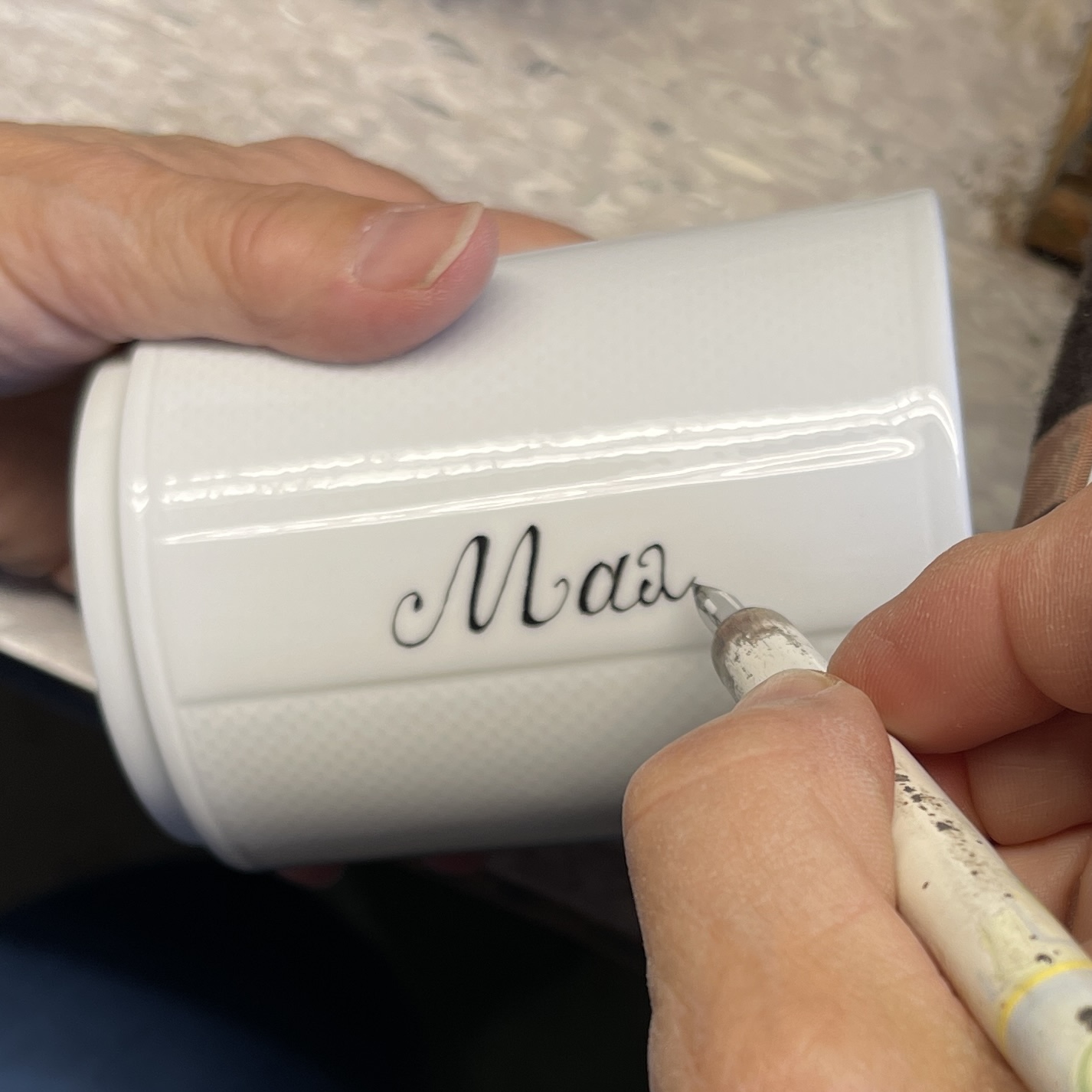 Die vielseitig verwendbaren Becher werden per Hand, ganz individuell mit dem Namen beschriftet oder mit Monogrammen, Spitznamen o.ä. verziert. Sie gestalten so ein ganz persönliches Präsent, das in unserem attraktiven Geschenkkarton zu einer besonderen Aufmerksamkeit wird.