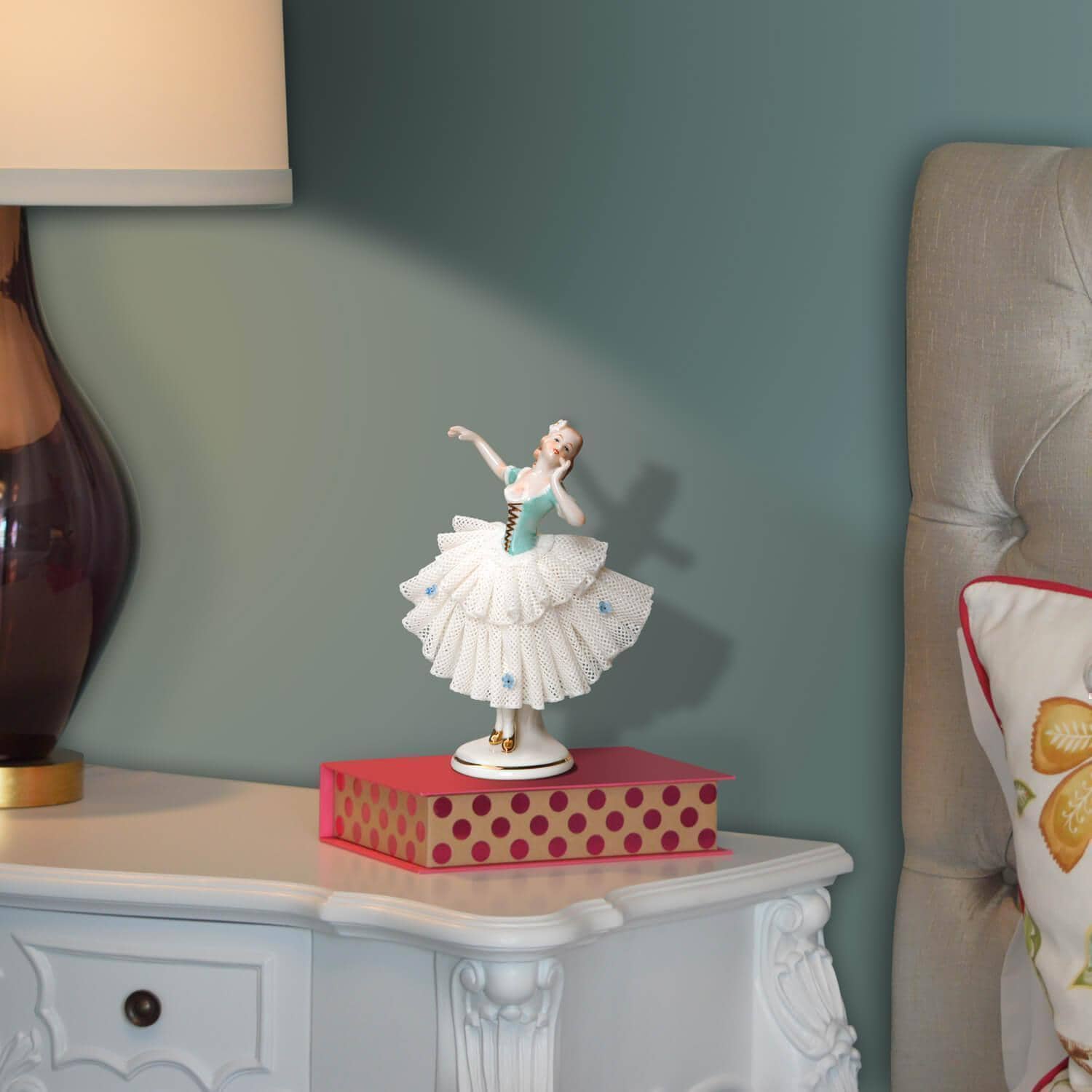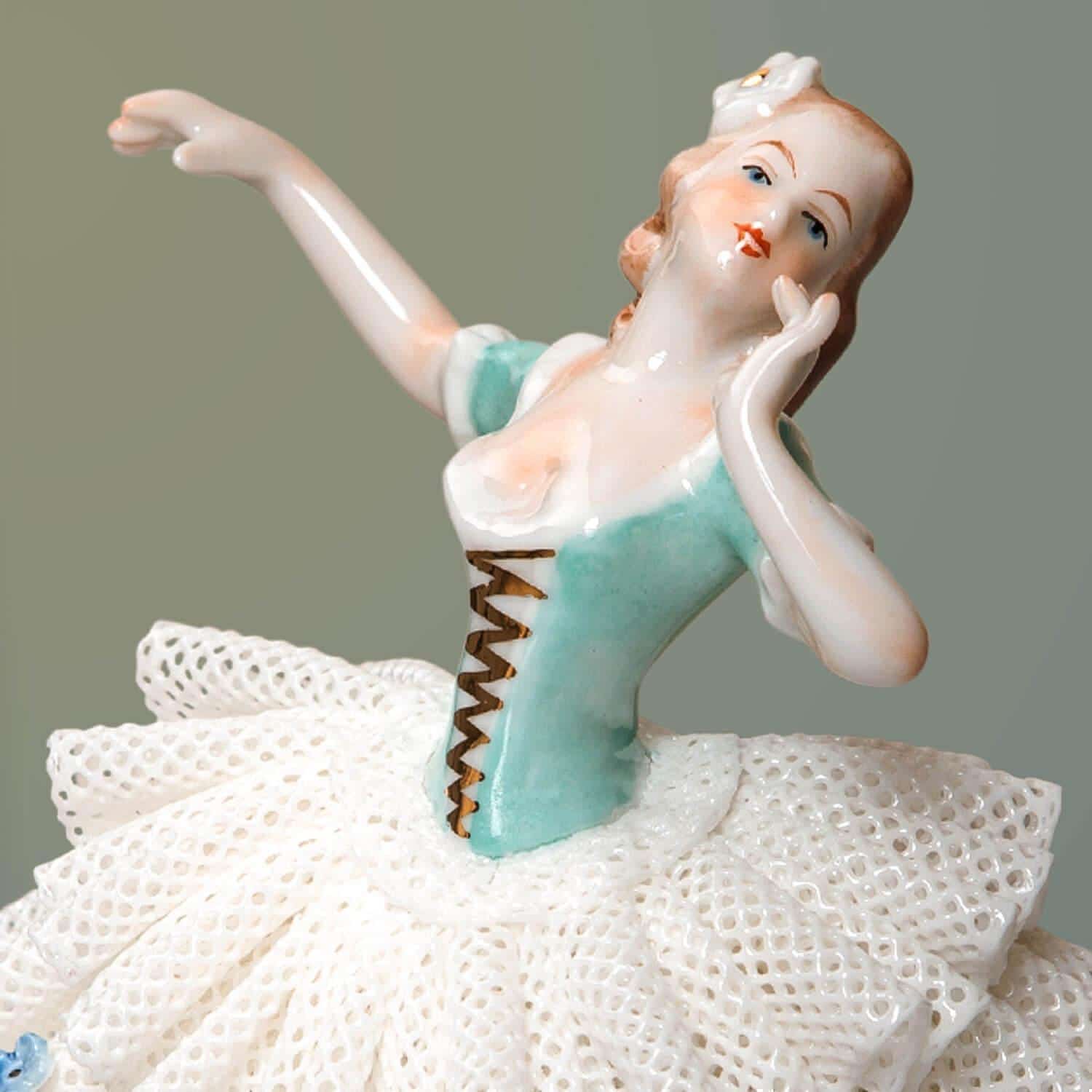 Ein ausdrucksstarker Beleg für die Kunstfertigkeit der Unterweissbacher Werkstätten für Porzellankunst ist die von Kurt Steiner erschaffene Porzellanfigur einer elegant tanzenden jungen Dame. Die kleine Statuette ist aus glasiertem Porzellan modelliert und in reiner Handarbeit bemalt.Sie trägt ein wunderschönes weißes zweilagiges Spitzenkleid mit einem türkisfarbenen Mieder. Den Übergang zwischen Oberteil und Rock bildet eine einlagig geraffte weiße Rüsche.Das türkisfarbene Mieder hat eine goldene Schnürung und weiß eingesäumte Träger.Die Darstellung des Rüschenrocks zeigt allergrößte Detailtreue. Man erkennt das Durchbrochene der Spitze bei jeder Lage. Zusätzlich sind fein geformte hellblaue Blüten auf dem kunstvoll gestalteten Rock arrangiert. Den harmonischen Abschluss dieser Porzellanfigur einer jungen Tänzerin bilden die goldenen Tanzschühchen und der mit einer goldenen Linie veredelte Sockel.Tanz drückt immer auch Gefühle aus. Diese kleine Porzellanstatuette strahlt eine fröhliche Ausgelassenheit aus und ist in jedem Ambiente ein dekoratives und wertvolles Schmuckstück.