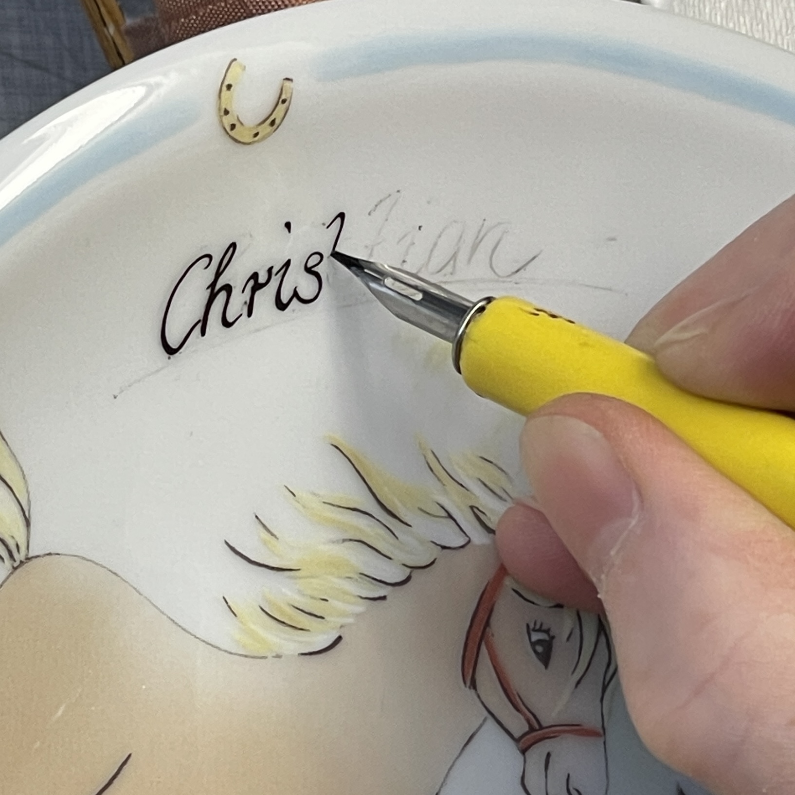 Der Frühstücksteller wird per Hand, ganz individuell mit dem Namen beschriftet oder mit Monogrammen, Spitznamen, u. ä. verziert. Sie gestalten so ein eigens auf das Kind bezogenes, persönliches Präsent.