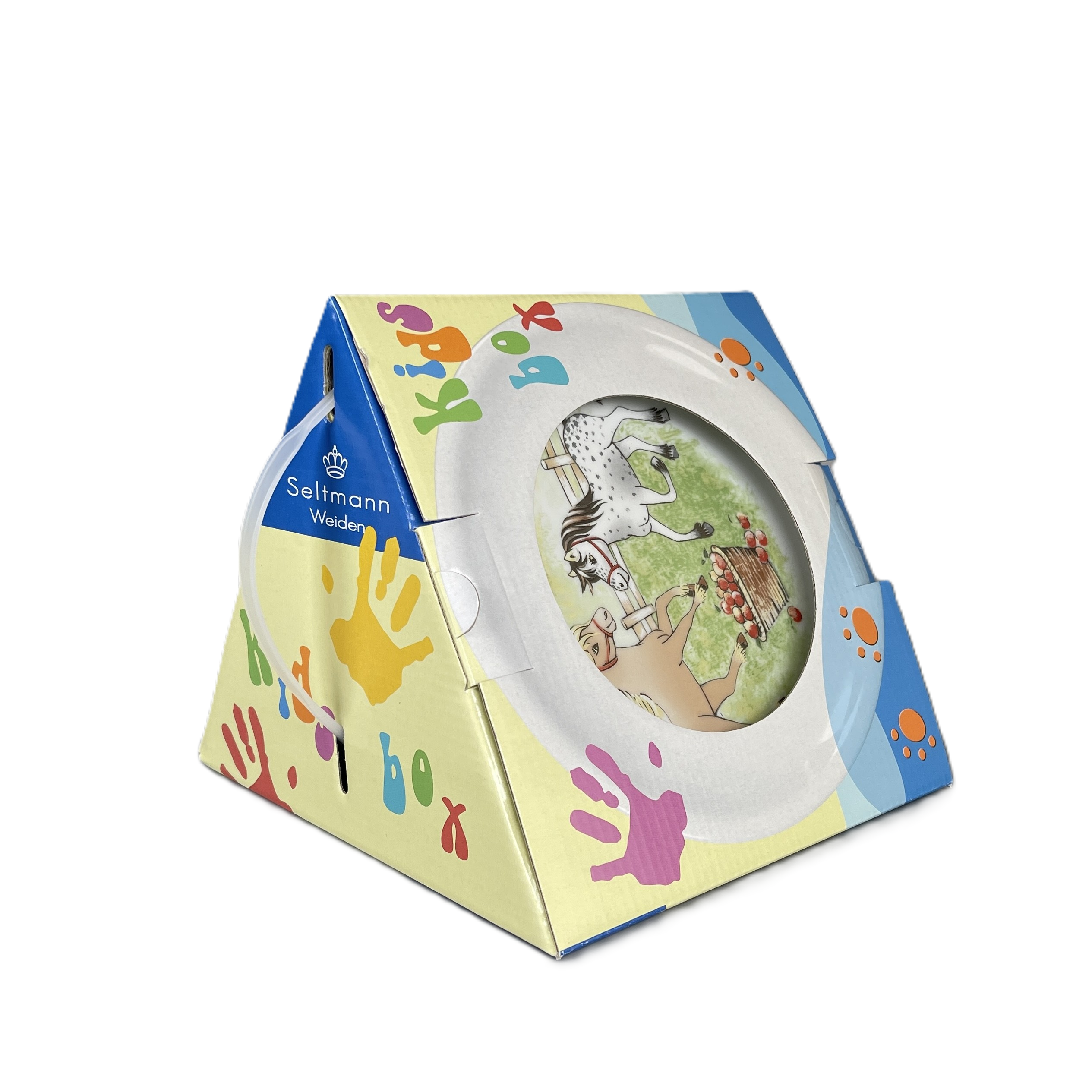 In dem attraktiven Geschenkkarton erhalten Sie außer dem individualisierten Teller auch eine Müslischale und einen Becher (jeweils ohne Beschriftung).